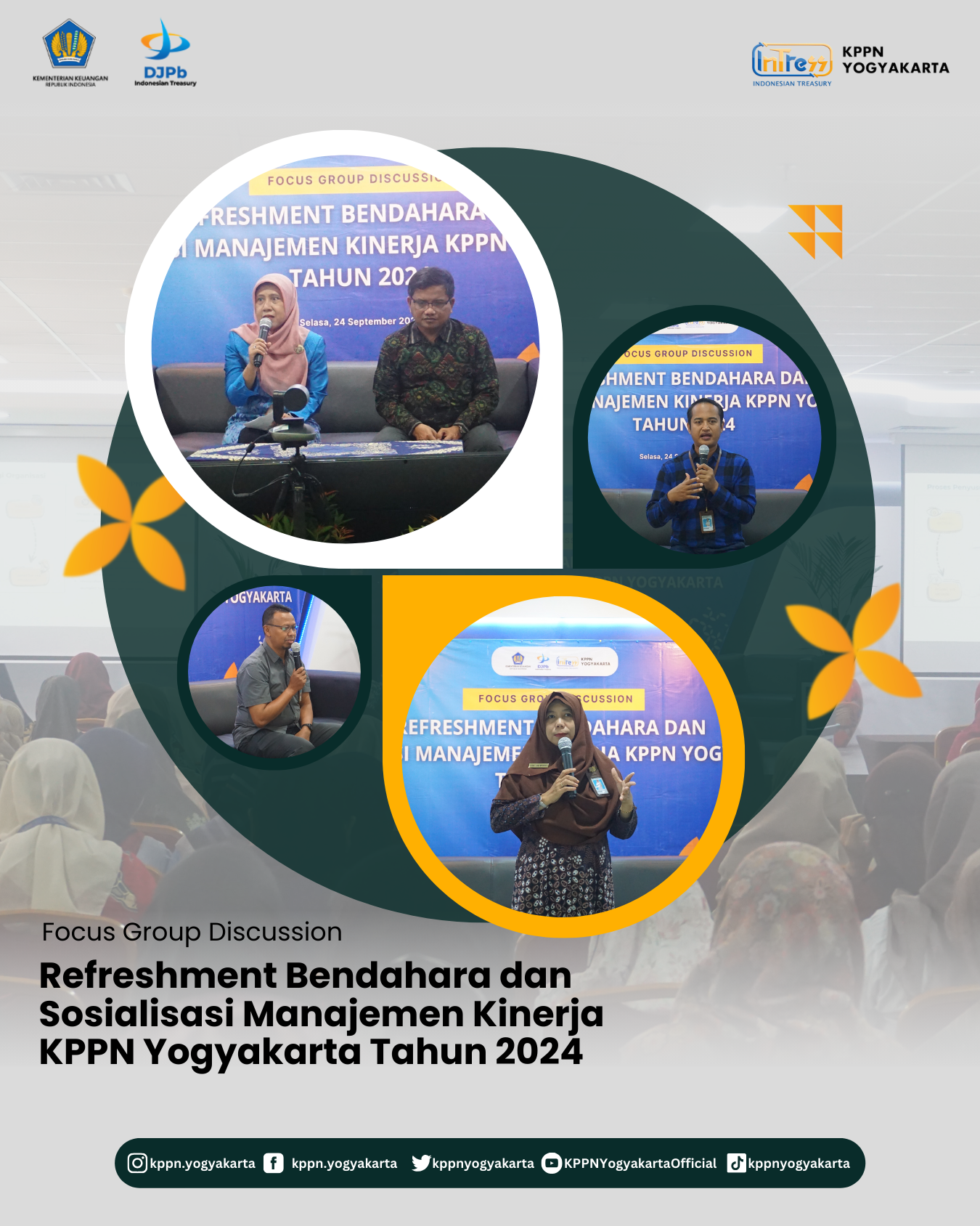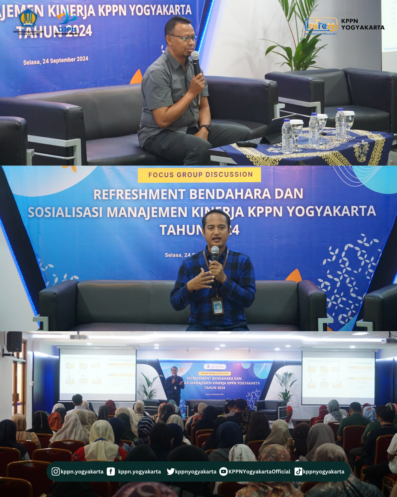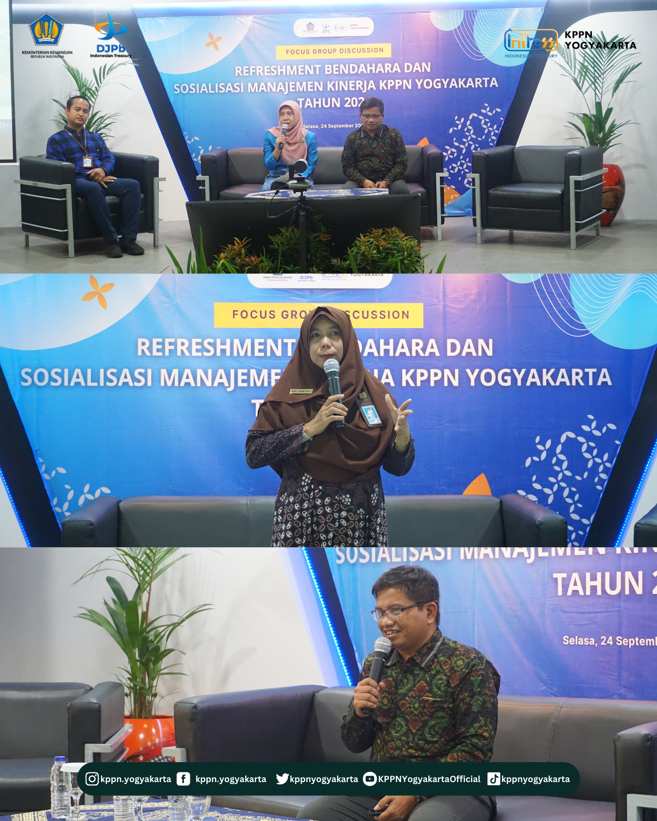 | Selasa (24/9) telah dilaksanakan Focus Group Discussion (FGD) Refreshment Bendahara dan Sosialisasi Manajemen Kinerja KPPN Yogyakarta Tahun 2024. Kegiatan ini dilaksanakan secara hybrid, online melalui zoom meeting dan offline di Aula Prambanan Lt. III GKN Yogyakarta yang terbagi dalam 2 sesi (sesi pagi 09.00 – 12.00 dan sesi siang 13.00 - 16.00). | |