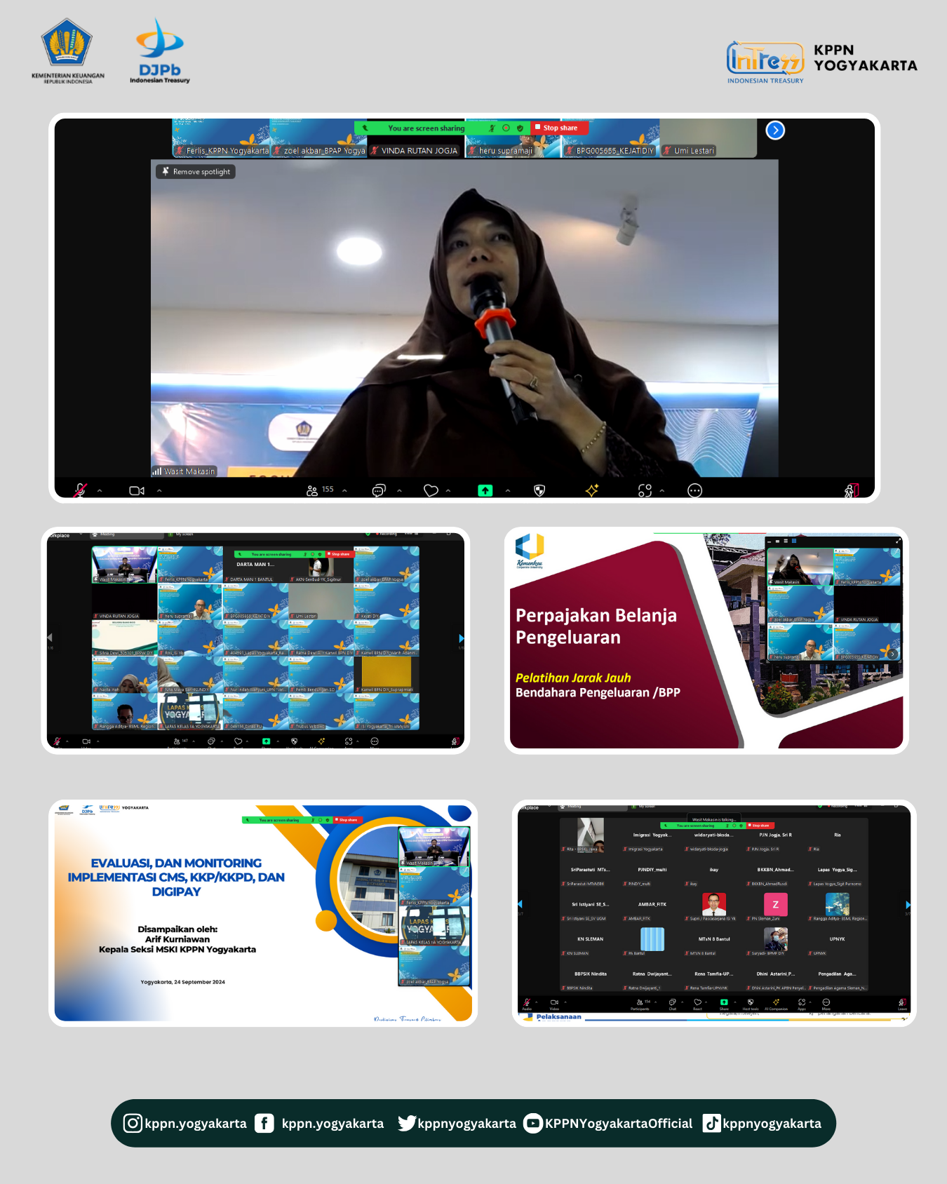 | Kegiatan ini dilaksanakan dengan tujuan membangun kebersamaan dengan Stakeholder agar pelaksanaan pengawalan APBN dapat berjalan baik, lancar, dan akuntabel. Kegiatan dimulai dengan sambutan Kepala KPPN Yogyakarta, Arvi Risnawati dengan ucapan terima kasih atas kerjasama yang baik yang telah terjalin selama ini. Ibu Arvi Risnawati juga mengingatkan kepada peserta terkait pentingnya menjaga integritas, berperilaku jujur, dan anti KKN maupun gratifikasi. Acara dilanjutkan dengan Materi I oleh Bapak Arif Kurniawan terkait Pengelolaan Kas dan Rekening pada Satker K/L dan Monitoring Implementasi Cashless Belanja APBN melalui Uang Persediaan (KKP, CMS, dan DIGIPAY). Dilanjutkan dengan Materi II oleh Ibu Sri Haryati yakni Verifikasi LPJ Rekening dan IKPA 2024, Perpajakan Bendahara Pengeluaran 2024, dan PMK Nomor 62 Tahun 2024. Materi III oleh Bapak Abdul Rosyid terkait Sosialisasi Manajemen Kinerja KPPN Yogyakarta. Materi IV oleh Nur Abdul Haris terkait Evaluasi Penyampaian SPM. | |