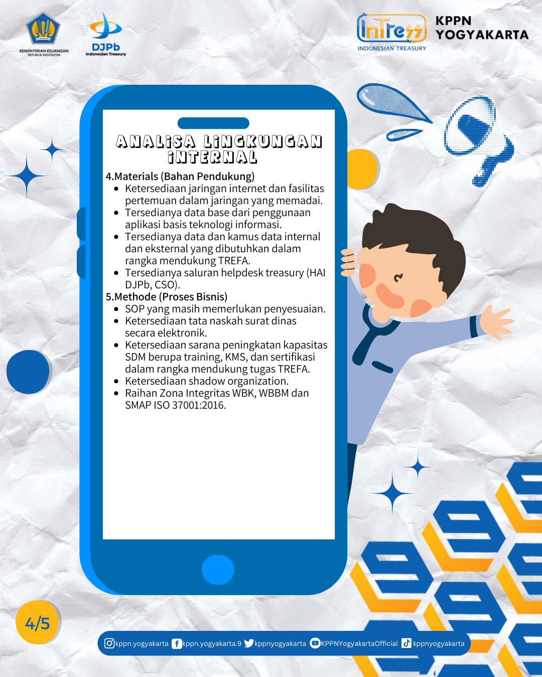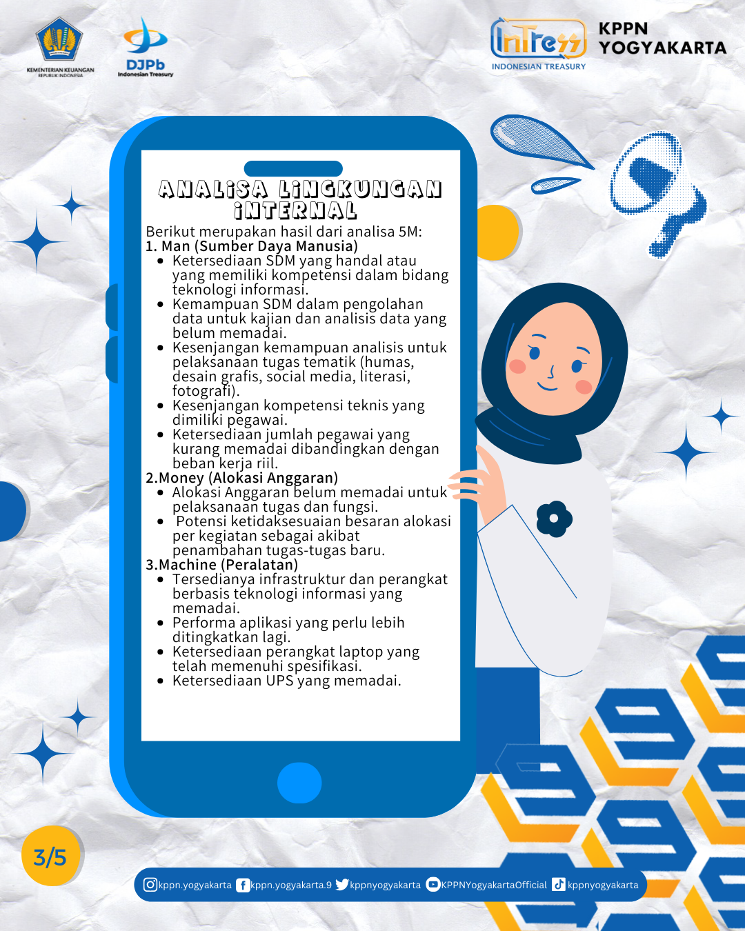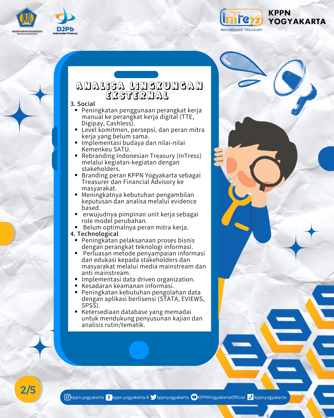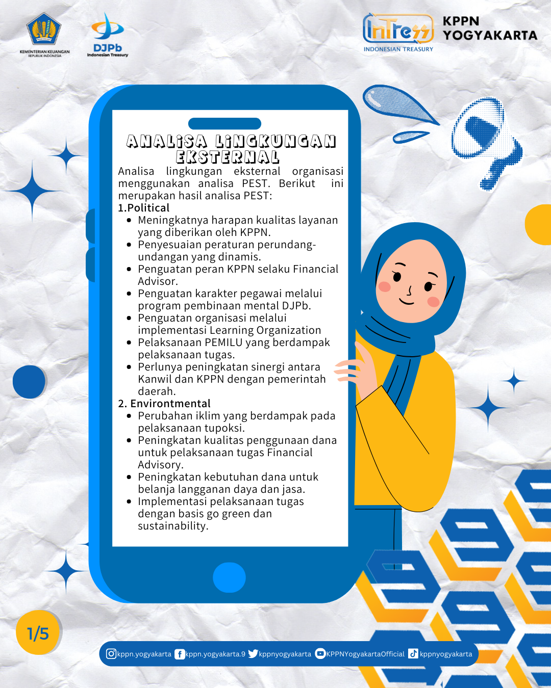 | KPPN Yogyakarta sebagai salah satu instansi vertikal dari DJPb mempunyai Visi dan Misi untuk mencapai tujuan organisasi. Dalam rangka mencapai Visi dan Misi yang kemudian diterjemahkan lebih detil dalam destination statement (road map), suatu organisasi harus mampu memformulasikan strategi organisasi. Strategi organisasi disusun berdasarkan analisis lingkungan eksternal dan internal. Salah satu alat/tools yang dapat digunakan ialah Analisa STEP, SWOT, dan Matriks TOWS. | |