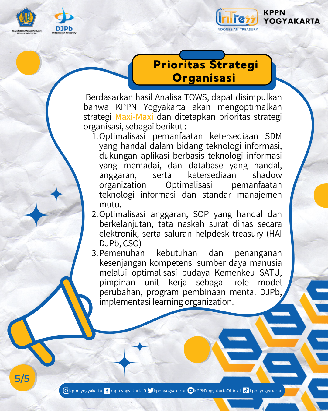 | Berdasarkan hasil Analisa TOWS dan melihat kondisi yang terjadi pada saat ini, dapat disimpulkan bahwa KPPN Yogyakarta akan mengoptimalkan strategi Maxi-Maxi dan ditetapkan prioritas strategi organisasi, sebagai berikut | |
