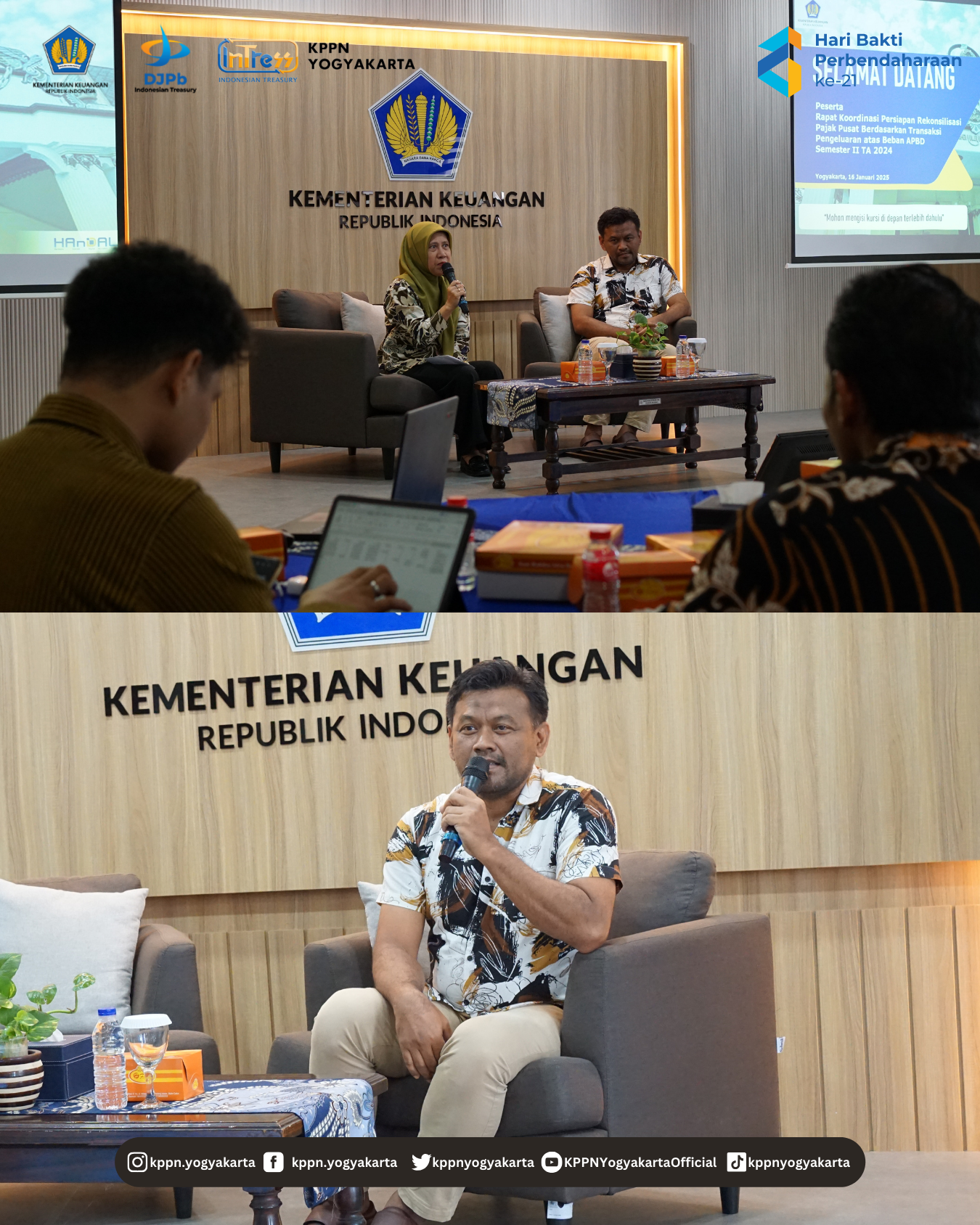 | Acara dibuka dengan sambutan oleh Kepala KPPN Yogyakarta, Ibu Arvi Risnawati dan dilanjutukan dengan penyampaian materi oleh Kepala Seksi Bank, Bapak Untara mengenai Persiapan Rekonsiliasi Pajak Pusat Semester II TA. 2024, selanjutnya diisi dengan sesi diskusi. | |