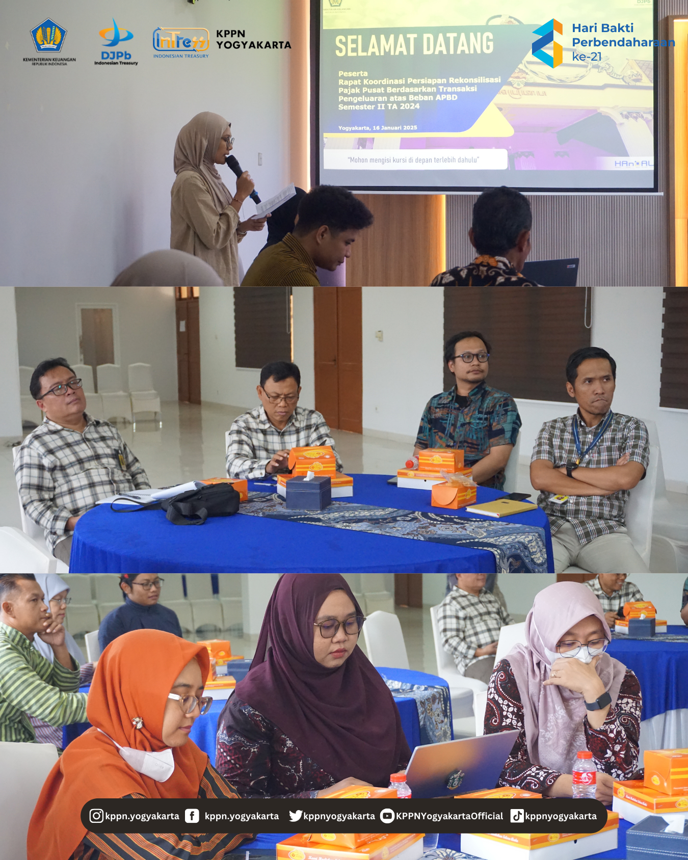 | KPPN Yogyakarta melaksanakan Rapat Koordinasi Persiapan Rekonsiliasi Pajak Pusat Berdasarkan Transaksi Pengeluaran atas Beban APBD Semester II TA 2024 pada Kamis, 16 Januari 2025 secara luring dengan peserta dari KPP Pratama Yogyakarta, Bantul, Sleman, dan Badan Pengelolaan Keuangan dan Aset Daerah DIY, Kab. Bantul, Kab. Sleman, Kota Yogyakarta. | |