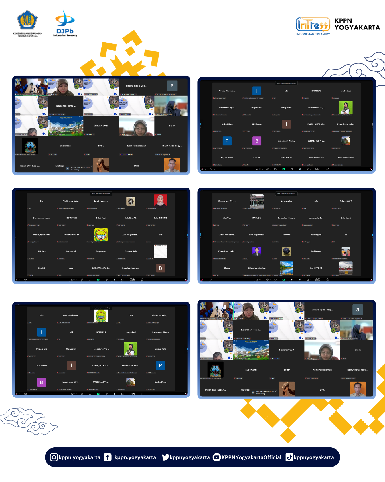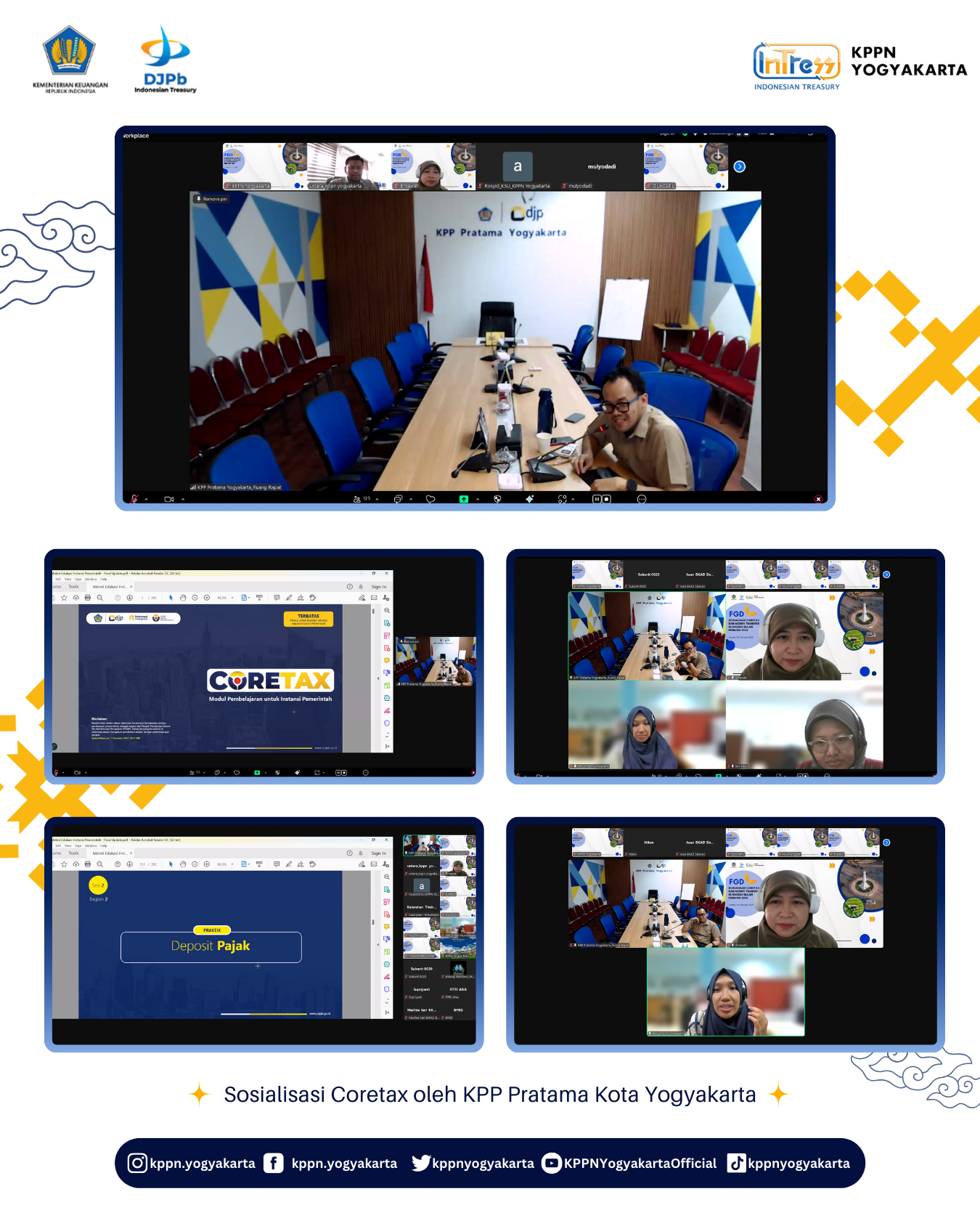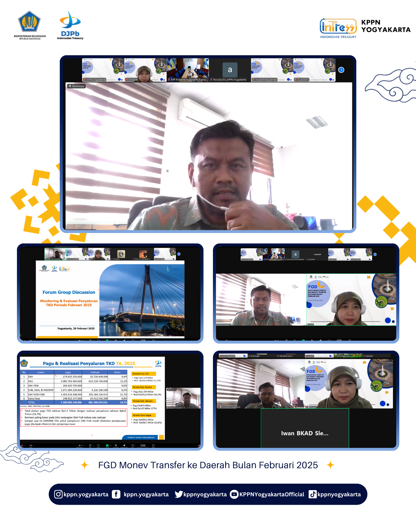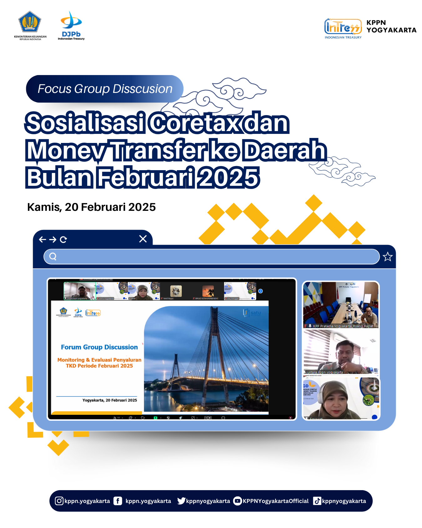 | KPPN Yogyakarta melaksanakan Sosialisasi Coretax dan Monev Transfer ke Daerah Bulan Februari 2025 pada Kamis, 20 Februari 2025 secara daring dengan peserta dari BPKAD, Inspektorat Daerah dan Perwakilan Dinas Pemda DIY, Kab. Sleman, Kota Yogyakarta dan Kab. Bantul, serta perwakilan pegawai KPPN Yogyakarta. Acara dibuka dengan sambutan oleh Kepala Seksi Bank, Bapak Untara dan dilanjutukan dengan penyampaian sosialisasi Coretax oleh KPP Pratama Kota Yogyakarta dan dilanjutkan dengan materi mengenai pagu dan realisasi penyaluran TKD bulan Februari, penyaluran DAK Fisik setiap Pemda/Pemprov dan dilanjutkan dengan sesi diskusi dan tanya jawab. |