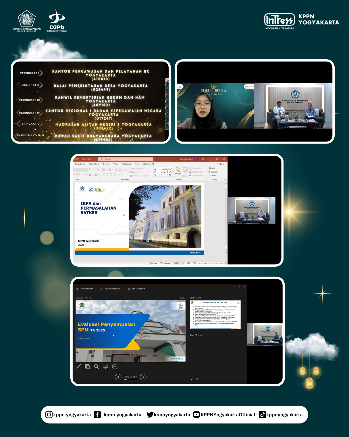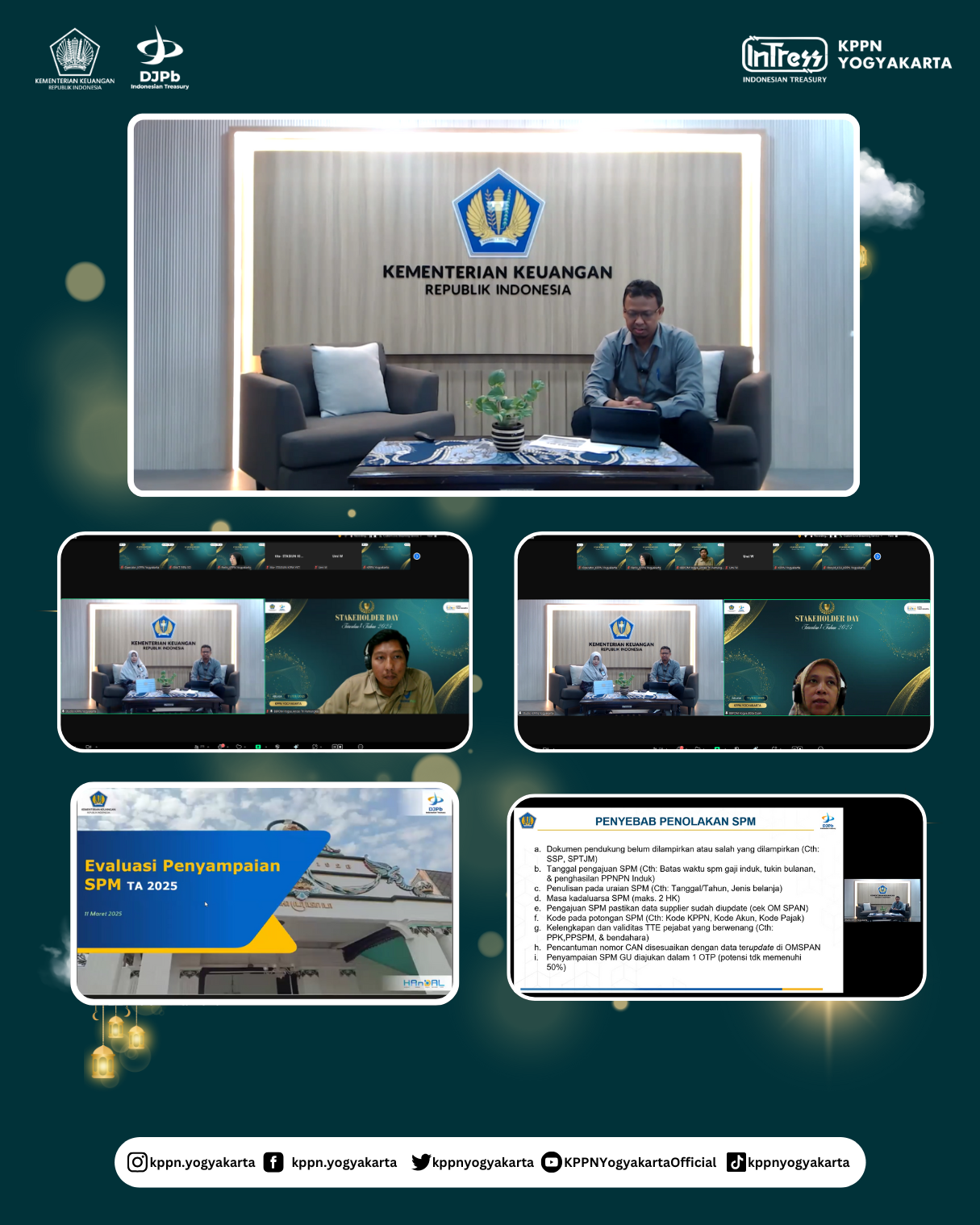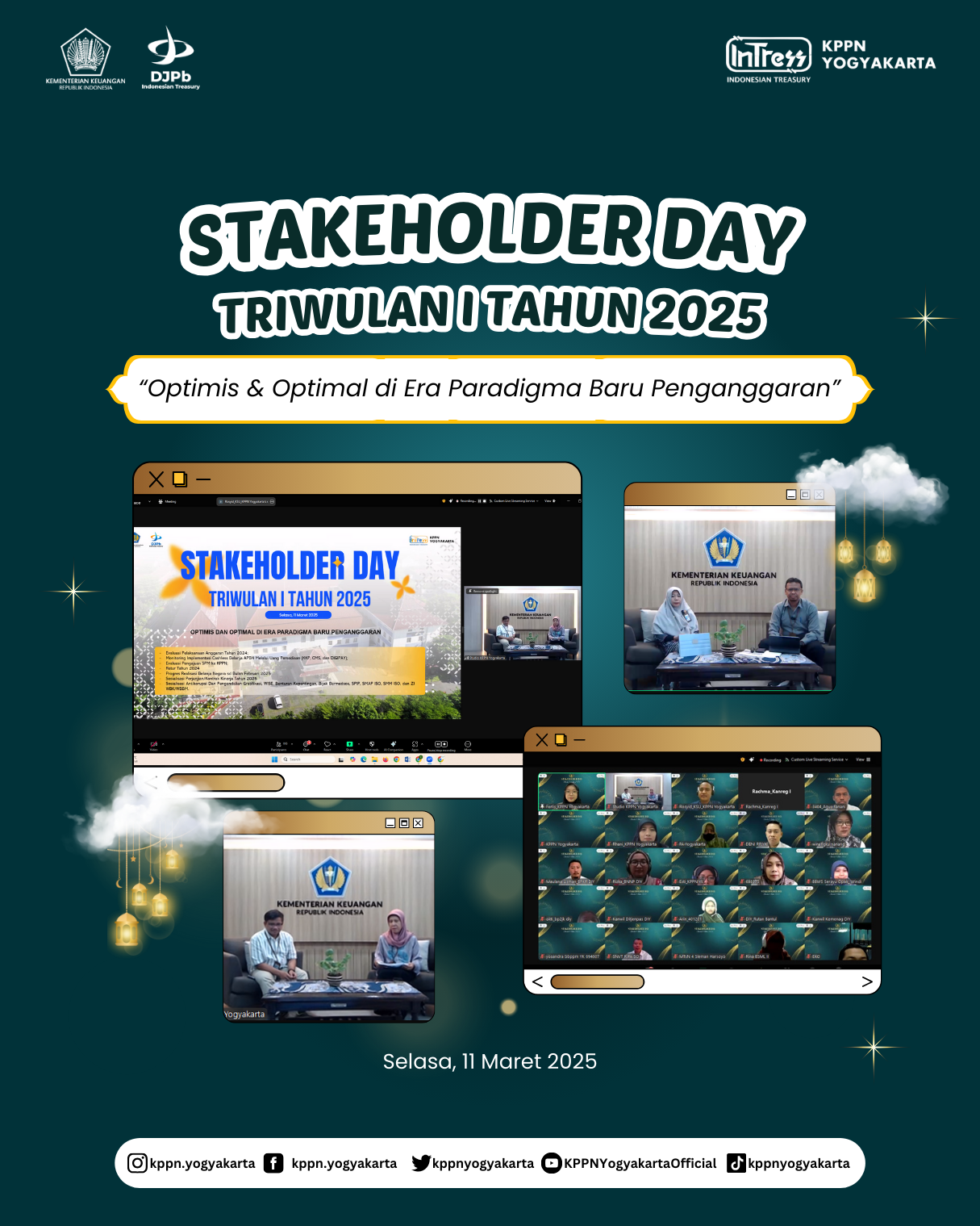 | KPPN Yogyakarta menggelar Stakeholder Day Triwulan I Tahun 2025 pada Selasa (11/3). Mengusung tema “Optimis dan Optimal di Era Paradigma Baru Penganggaran” kegiatan ini dihadiri oleh seluruh satuan kerja lingkup KPPN Yogyakarta secara daring. | |