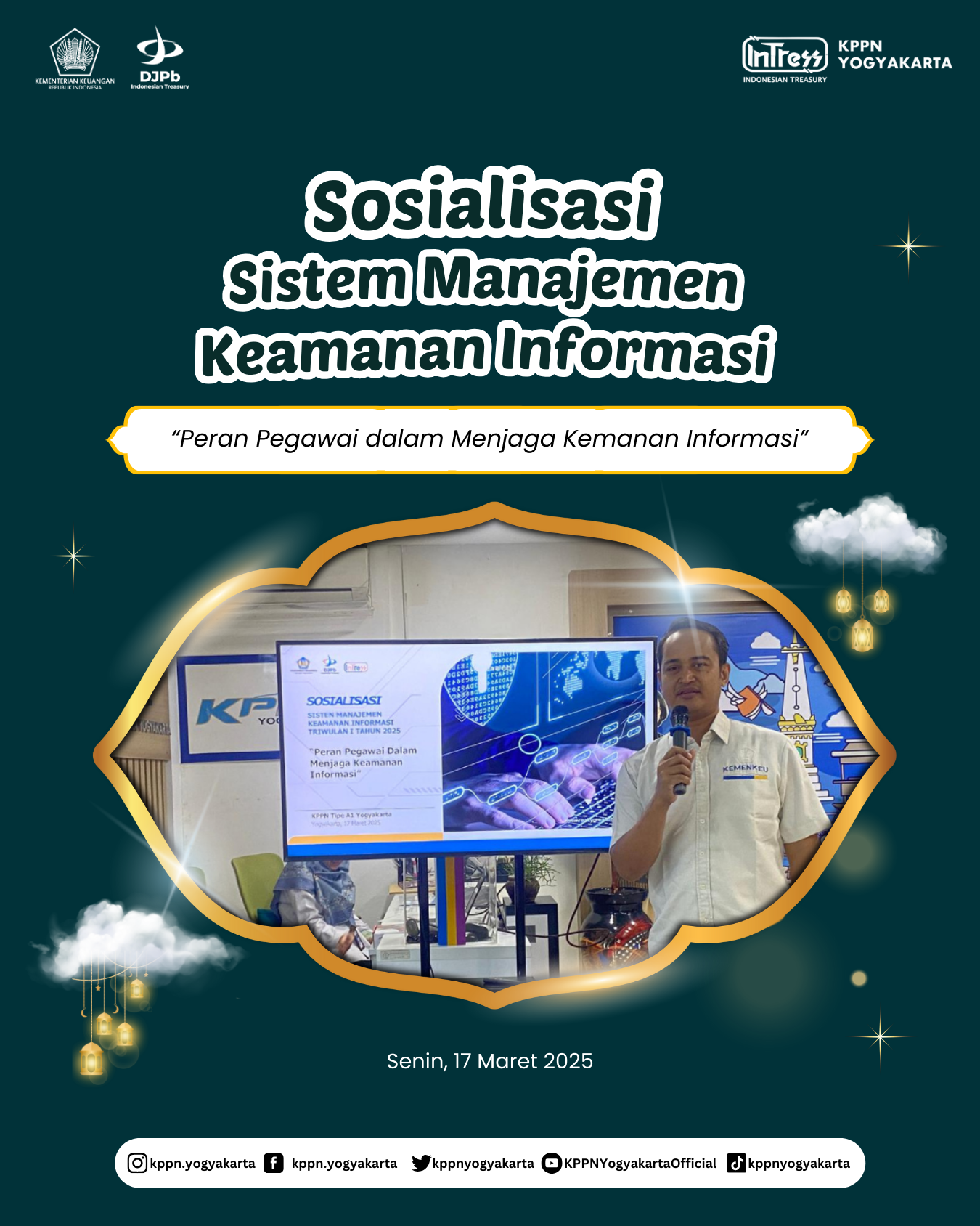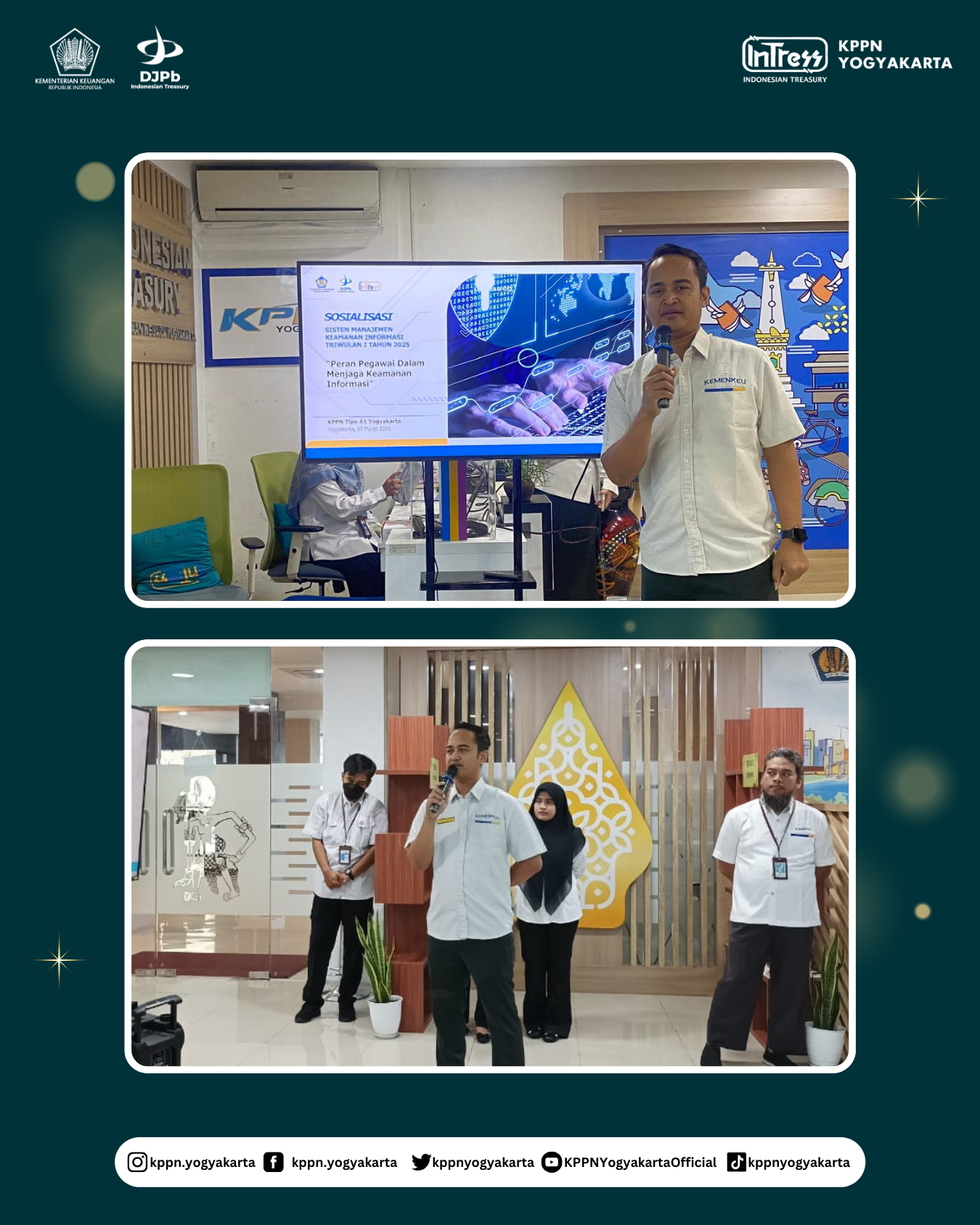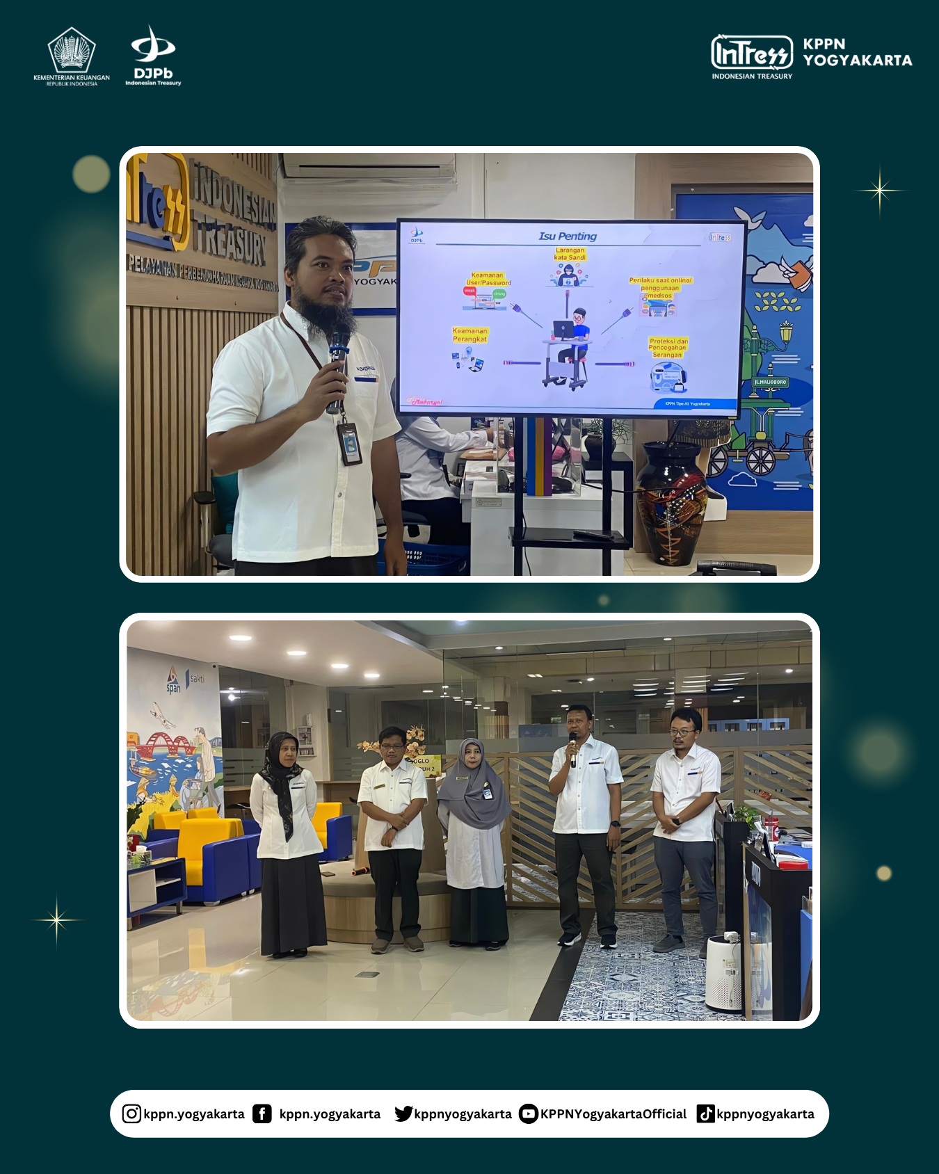 | KPPN Yogyakarta telah menyelengarakan Gugus Kendali Mutu terkait Sosialisasi Sistem Manajemen Keamanan Informasi yang bertema “Peran Pegawai dalam Menjaga Kemanan Informasi”.Materi dipaparkan oleh Narasumber Bapak Abdul Rosyid dan Bapak Moh Ali Imron. Sebagai bagian dari organisasi, setiap individu punya peran penting dalam menjaga keamanan data dan informasi. Dengan pemahaman yang lebih baik, kita bisa mencegah risiko kebocoran dan ancaman siber! | |