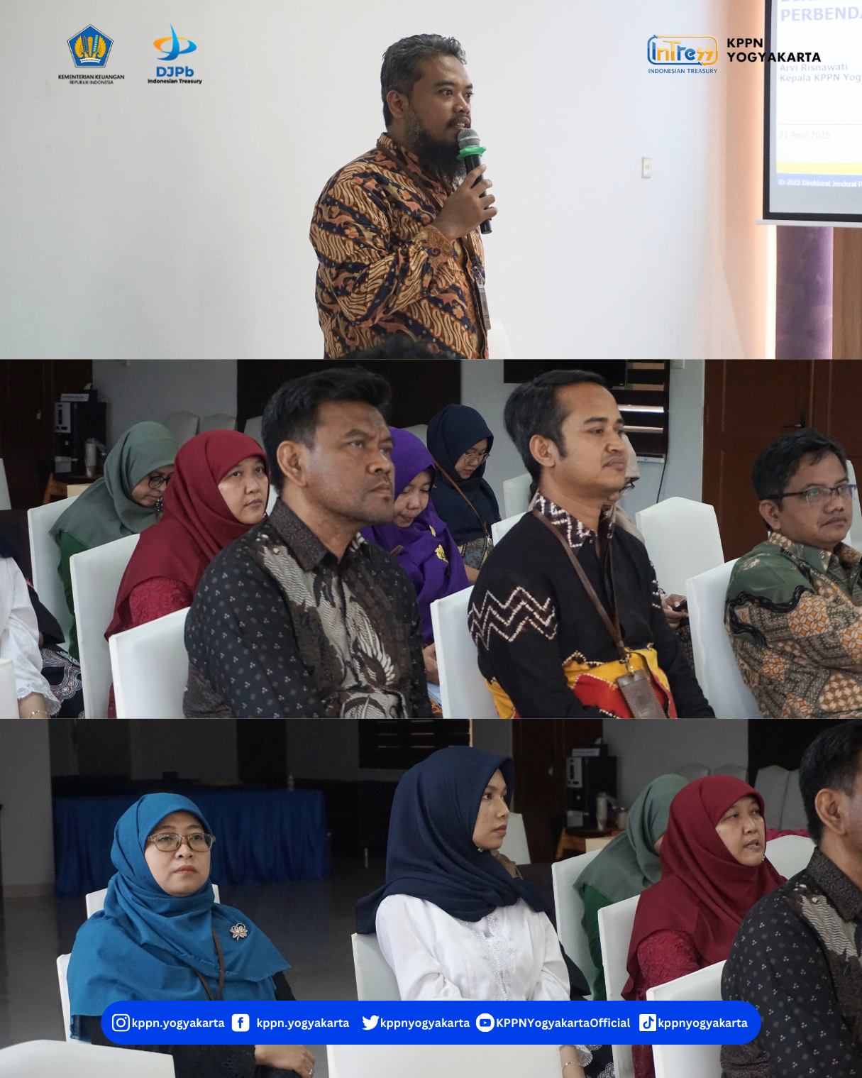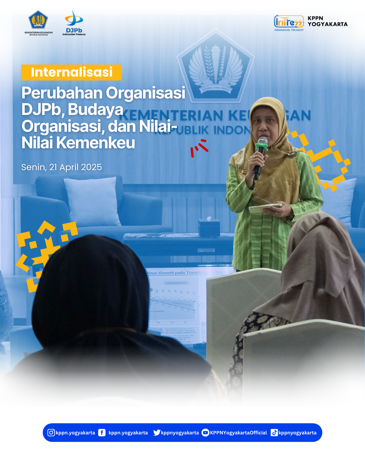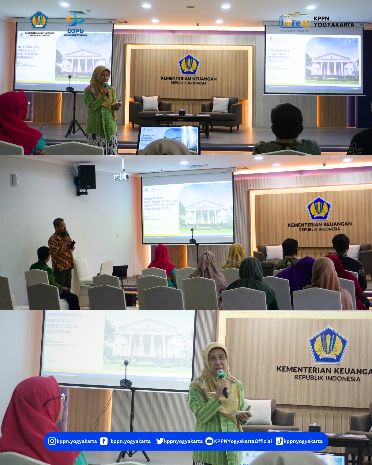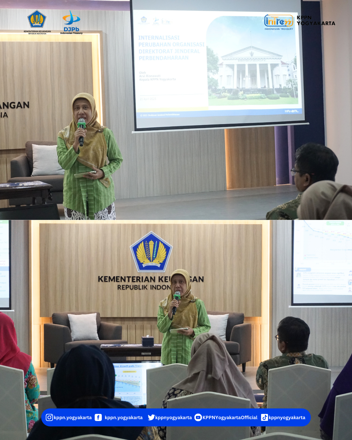 | KPPN Yogyakarta telah menyelengarakan Internalisasi Perubahan Organisasi DJPb, Budaya Organisasi dan Nilai-Nilai Kemenkeu pada Senin, 21 April 2025 di Aula KPPN Yogyakarta”.Materi dipaparkan oleh Narasumber Kepala KPPN Yogyakarta, Ibu Arvi Risnawati. | |