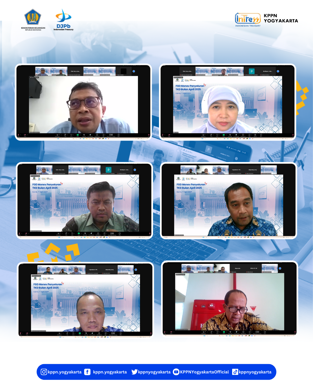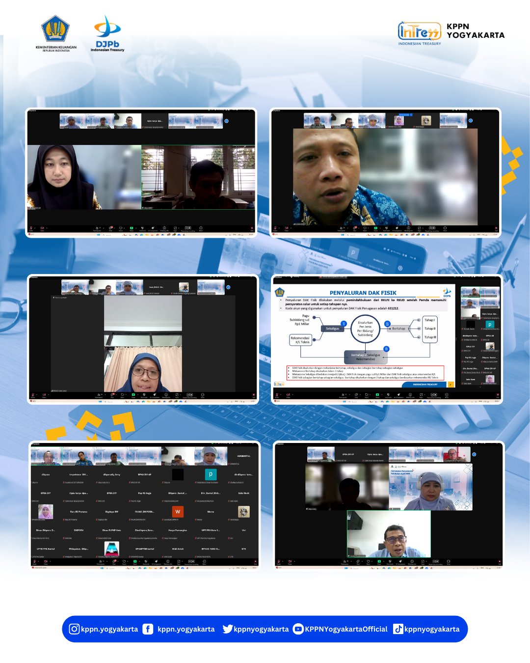 | KPPN Yogyakarta (22/7) telah melaksanakan FGD Monev Penyaluran Transfer ke Daerah Bulan April 2025 secara daring dengan peserta BPKAD, Inspektorat Daerah dan Perwakilan Dinas Pemda DIY, Kab. Sleman, Kota Yogyakarta dan Kab. Bantul, serta perwakilan pegawai Kanwil DJPb DIY dan KPPN Yogyakarta. Acara dibuka oleh Kepala Seksi Bank, Bapak Untara dan dilanjutkan dengan penyampaian materi terkait raport penyaluran TKD s.d. April 2025 oleh masing-masing Pemda/Pemprov dan dilanjutkan dengan sesi diskusi dan tanya jawab. | |