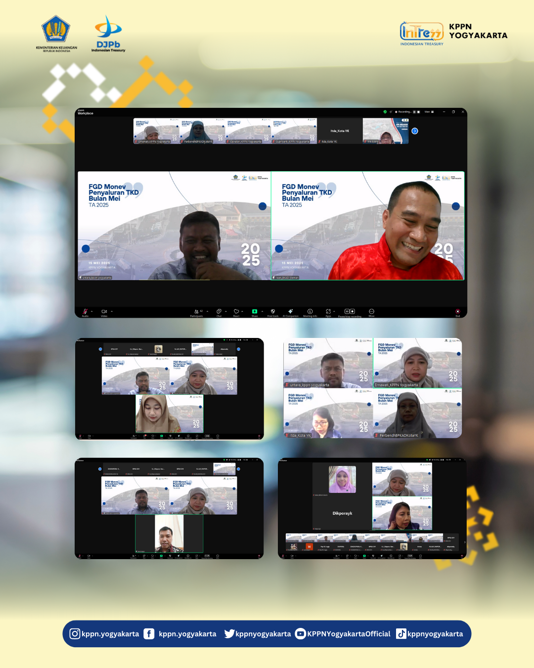 | KPPN Yogyakarta (15/5) telah melaksanakan FGD Monev Penyaluran Transfer ke Daerah Bulan Mei 2025 secara daring dengan peserta BPKAD, Inspektorat Daerah dan Perwakilan Dinas Pemda DIY, Kab. Sleman, Kota Yogyakarta dan Kab. Bantul, serta perwakilan pegawai Kanwil DJPb DIY dan KPPN Yogyakarta. Acara dibuka oleh Kepala Seksi Bank, Bapak Untara dan dilanjutkan dengan penyampaian materi tentang juknis penyaluran Dana Desa tahap II tahun 2025 dan juknis penyaluran DAK Fisik tahun 2025. Kegiatan dilanjutkan dengan raport penyaluran TKD s.d. April 2025 oleh masing-masing Pemda/Pemprov dan dilanjutkan dengan sesi diskusi dan tanya jawab. |