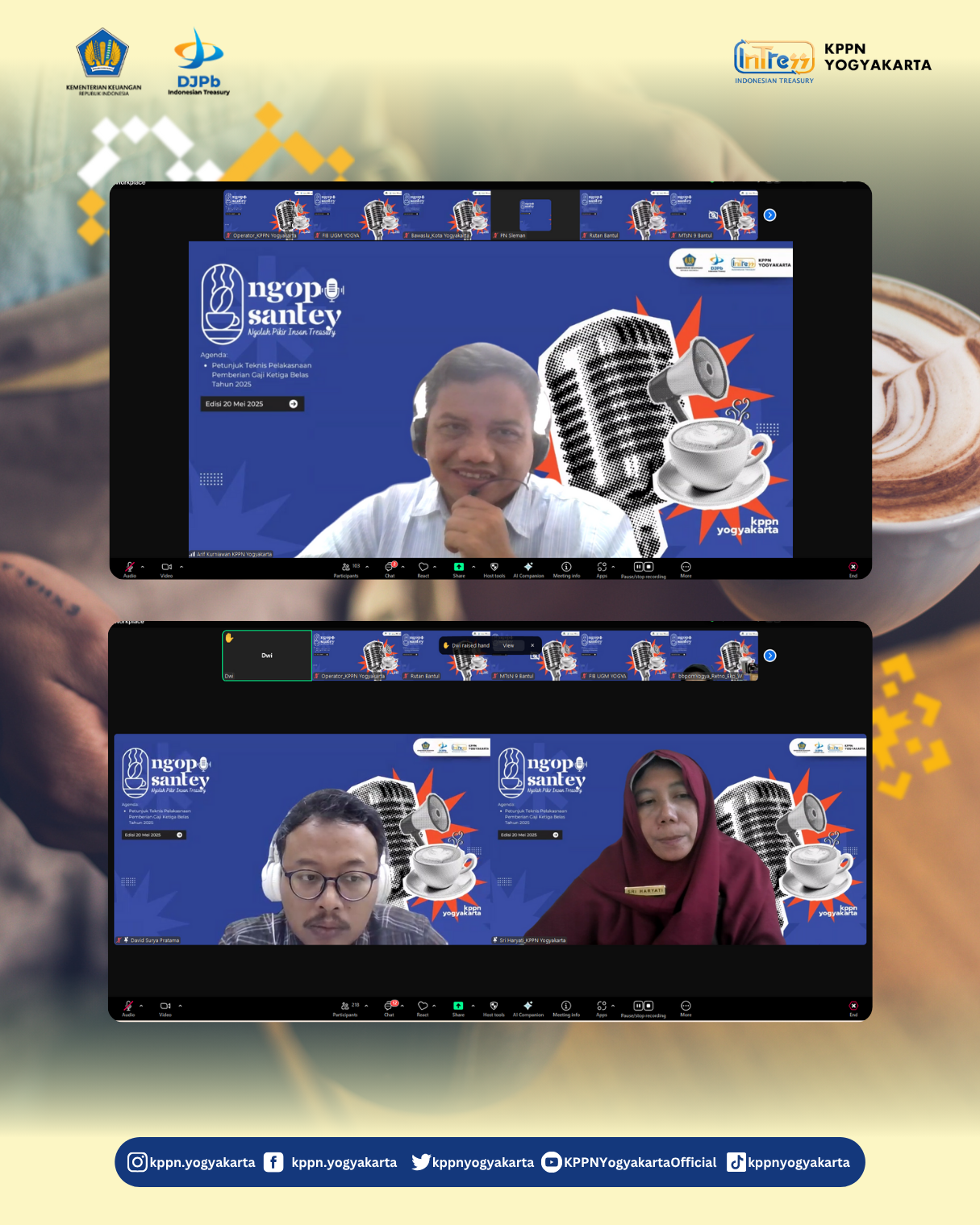 | Ngolah Pikir Bareng Insan Treasury (NGOPI SANTEY) KPPN Yogyakarta kembali hadir menyapa seluruh stakeholders KPPN Yogyakarta. NGOPI SANTEY Edisi 20 Mei 2025 mengambil tema "Petunjuk Teknis Pelaksanaan Pemberian Gaji Ke-13. | |