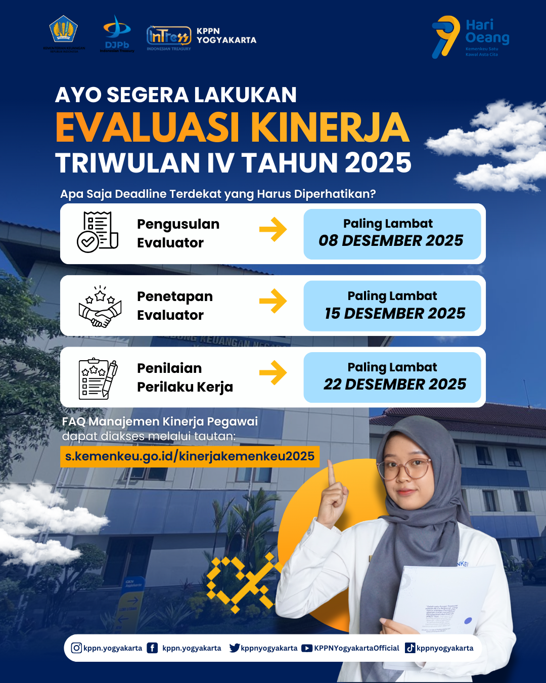 | Pelaksanaan Evaluasi Kinerja Triwulan IV Tahun 2025 telah dimulai. Setiap pegawai diharapkan dapat melaksanakan proses ini secara objektif, transparan, dan sesuai ketentuan. Perhatikan jadwal yang telah ditentukan dan jangan sampai ketinggalan. Jadwal selengkapnya, panduan aplikasi, dan FAQ seputar kebijakan manajemen kinerja pegawai dapat diakses melalui melalui tautan https://s.kemenkeu.go.id/kinerjakemenkeu2025. Dalam rangka mengukur pemahaman pegawai Kementerian Keuangan atas kebijakan manajemen kinerja, dimohon kesediaan seluruh pegawai untuk mengikuti survei yang dapat diakses melalui tautan https://s.kemenkeu.go.id/Surveikinerja. Pertanyaan dan kendala seputar aplikasi dapat disampaikan melalui email pada alamat Alamat email ini dilindungi dari robot spam. Anda memerlukan Javascript yang aktif untuk melihatnya. Ayo kita wujudkan kontribusi dan kinerja terbaik demi Kemenkeu Satu! |