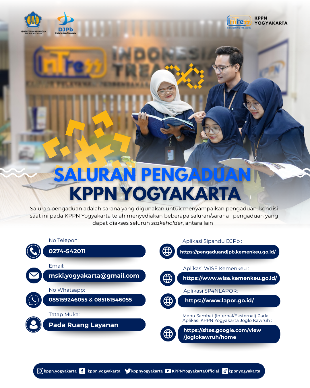 Sedulur Jogja #InTress030 KPPN Yogyakarta senantiasa berkomitmen untuk memberikan pelayanan yang profesional, transparan, dan berintegritas kepada seluruh satuan kerja dan stakeholder. Sebagai bentuk keterbukaan serta upaya peningkatan kualitas layanan, kami menyediakan berbagai saluran pengaduan yang dapat dimanfaatkan untuk menyampaikan masukan, saran, maupun pengaduan terkait layanan KPPN Yogyakarta. Setiap pengaduan yang disampaikan akan kami terima, catat, dan tindak lanjuti secara objektif, bertanggung jawab, serta sesuai dengan ketentuan yang berlaku. Partisipasi aktif dari para stakeholder menjadi bagian penting dalam mewujudkan pelayanan publik yang semakin baik dan berkelanjutan. Mari bersama-sama kita bangun budaya pelayanan yang responsif dan akuntabel demi mendukung pengelolaan keuangan negara yang andal serta berorientasi pada kepuasan pengguna layanan. 📍 Seluruh saluran pengaduan KPPN Yogyakarta dapat diakses melalui informasi pada poster ini. #KPPNYogyakarta #DJPb #KementerianKeuangan #SaluranPengaduan #PelayananPrima #ZonaIntegritas #WBK #WBBM #APBNKita |