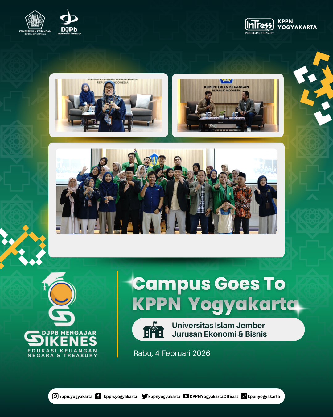 | Diharapkan, dengan kegiatan SIKENES/Campus Goes to KPPN Yogyakarta ini dapat menambah ilmu tentang dunia keuangan bagi para generasi muda dan juga memberi wawasan baru serta semangat dalam melanjutkan pendidikan yang lebih tinggi. #InTress #DJPb #UangKita #HAnDAL #CampusGoesToTreasury #APBNKiTa #APBNuntukRakyat #kemenkeu #kppn #kppnyogyakarta #APBN #kppnkawalapbn #integrity #fyp #foryourpage #Edukasi #Yogyakarta #AmanSetaraBersamaDJPB |