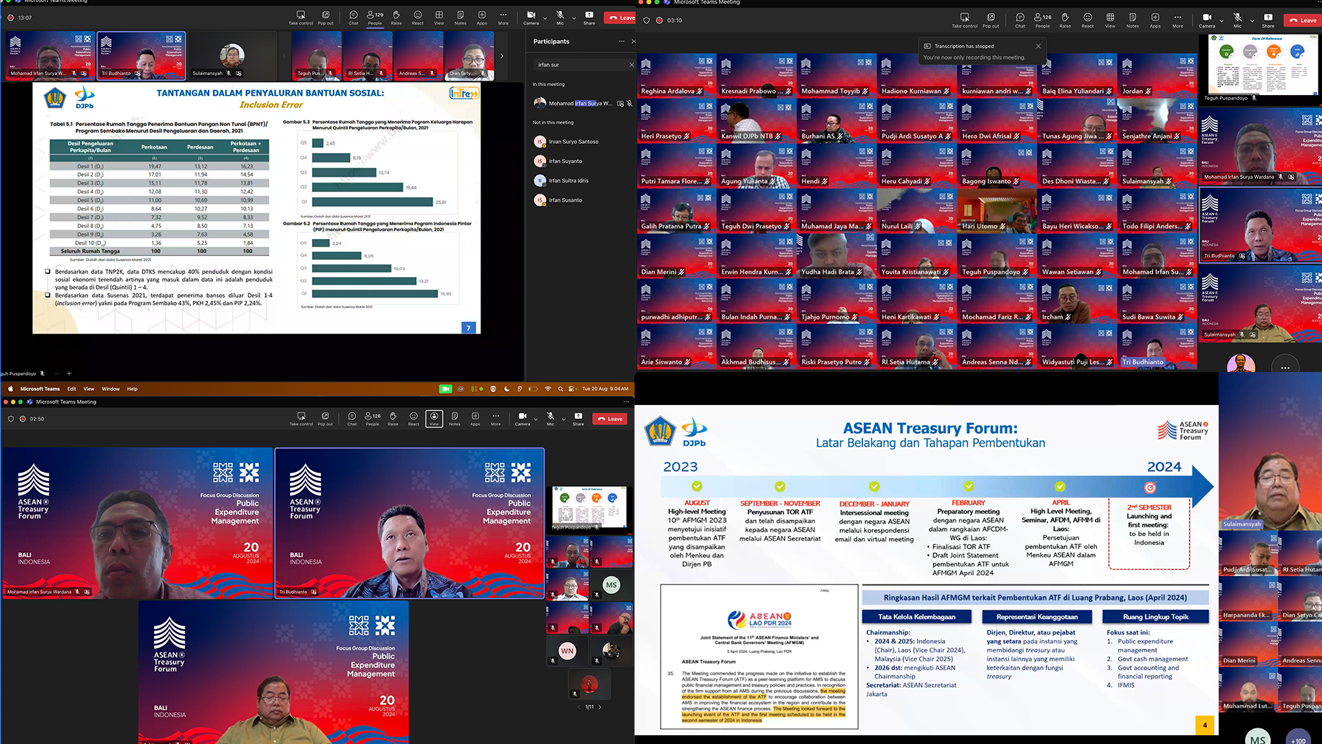 Pada forum tersebut, Direktur Pelaksanaan Anggaran Tri Budhianto menyampaikan paparan isu strategis treasury terkait pengelolaan belanja publik (Public Expenditure Management) yang menjadi fokus utama dalam mendukung program-program perlindungan sosial (perlinsos) di negara-negara ASEAN. Dengan capaian yang telah diperoleh Indonesia dalam pengelolaan perlinsos, Direktur Pelaksanaan Anggaran mengungkapkan masih terdapat beberapa tantangan dalam pengelolaan belanja publik khususnya terkait ketepatan sasaran penerima bantuan sosial.