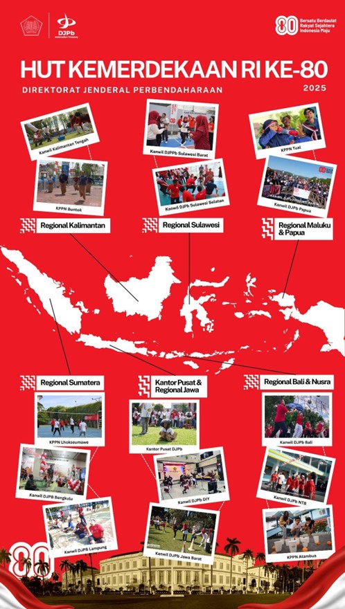 Jakarta, 17 Agustus 2025 – Direktorat Jenderal Perbendaharaan (DJPb) Kementerian Keuangan menyemarakkan Hari Ulang Tahun ke-80 Republik Indonesia dengan penuh semangat kebersamaan. Dari Sabang sampai Merauke, pegawai DJPb di seluruh penjuru tanah air melaksanakan upacara bendera serta perlombaan khas 17-an sebagai wujud rasa syukur dan cinta kepada Ibu Pertiwi.